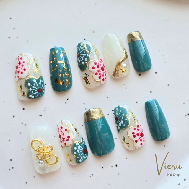 【ネイルチップ】グリーン×ホワイト 花柄 和柄 振袖 成人式 卒業式